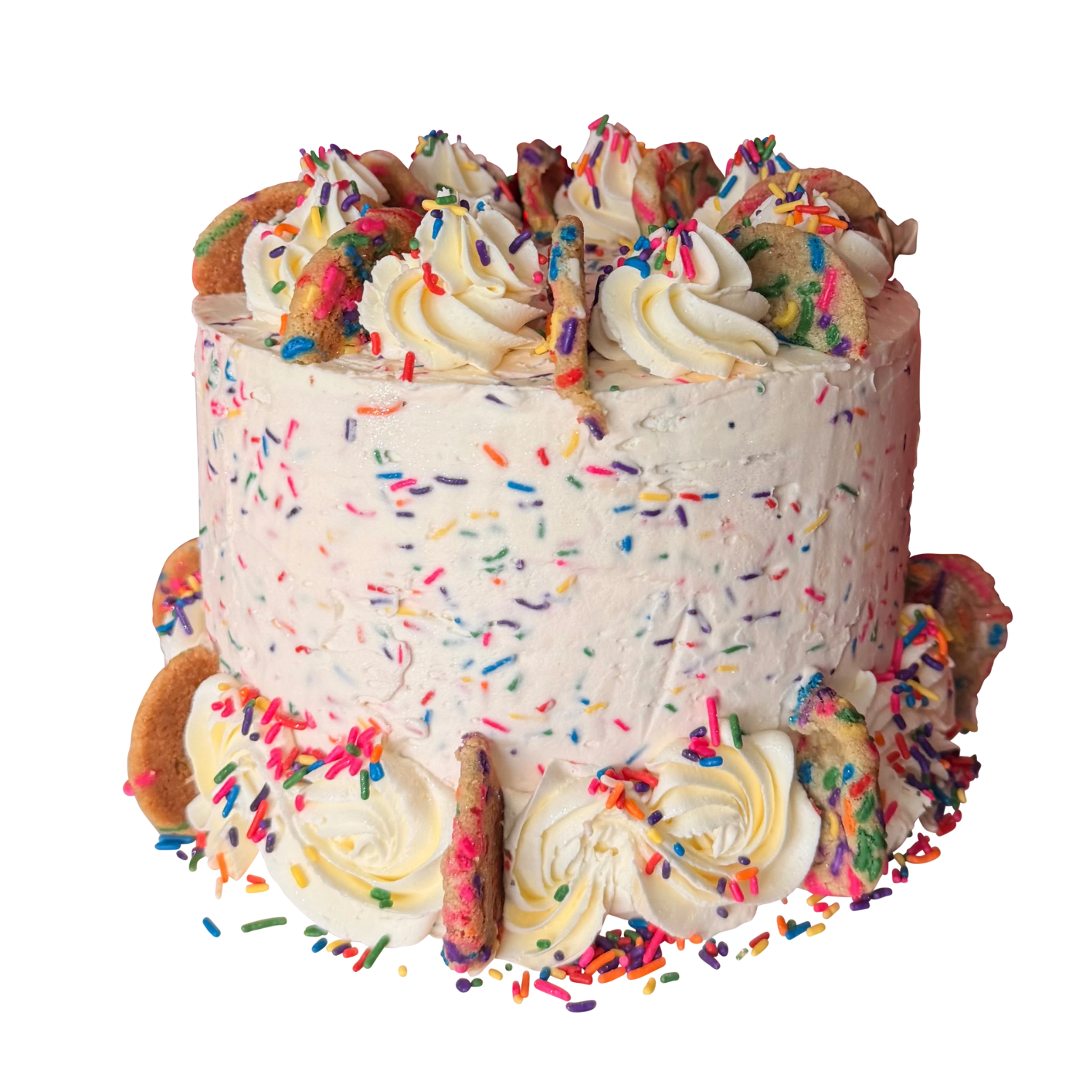 A festive gluten-free confetti cookie birthday cake layered with vanilla buttercream frosting and confetti cookie filling, topped with colorful confetti cookies.